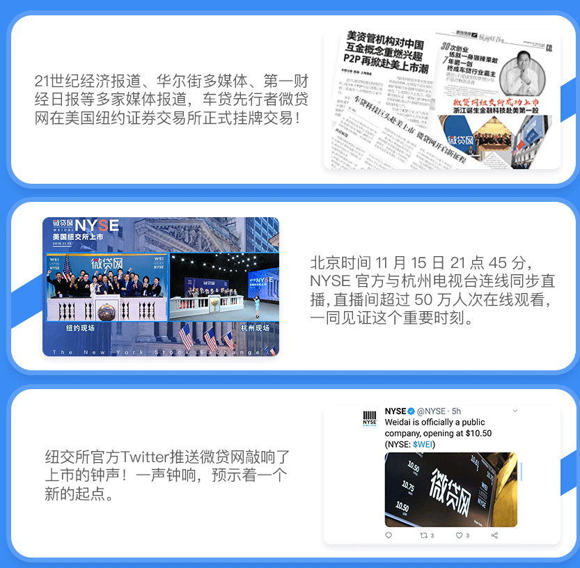 微贷网最风光的无疑是2018年底在美国上市,2018年11月15日晚,微贷网在美国纽交所上市,成为浙江第二家P2P上市公司。