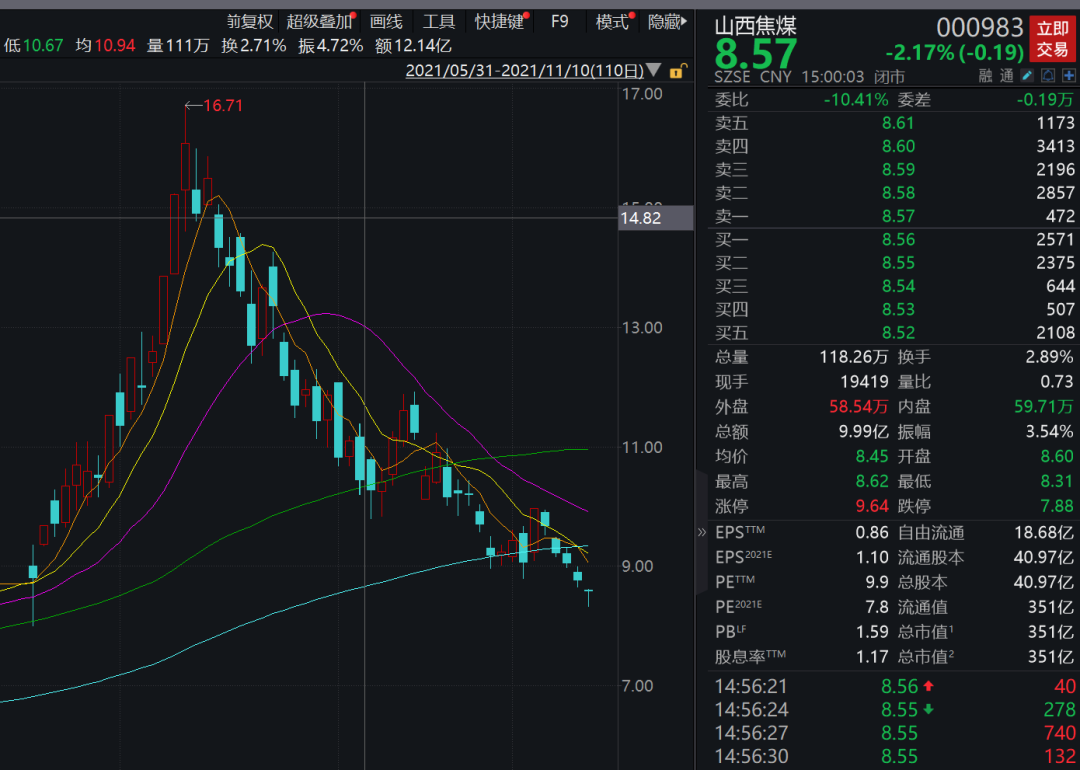 涨起来凶猛的煤价,跌起来也相当快速。以动力煤期货为例,自10月19日创下1982元的历史新高后,仅仅10个交易日,就跌至最低841元,跌幅高达57%。