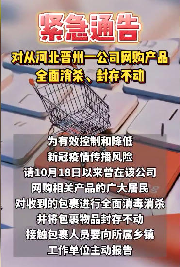 “请10月18日以来曾在晋州市浩汇商贸有限公司网购相关产品的广大居民,对收到的包裹进行全面消毒消杀,并将包裹物品封存不动,接触包裹人员要向所属乡镇(街道、开发区)、工作单位主动报告”。