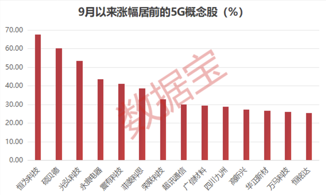证券时报·数据宝统计,A股市场上,5G概念股合计有330多只。9月以来,受华为Mate60系列产品各项指标“遥遥领先”的影响,多家上市公司透露“含华量”,华为产业链(含5G概念股)个股持续走强。恒为科技、硕贝德、光弘科技涨超50%,永贵电器、震有科技、菲菱科思等涨幅超30%。