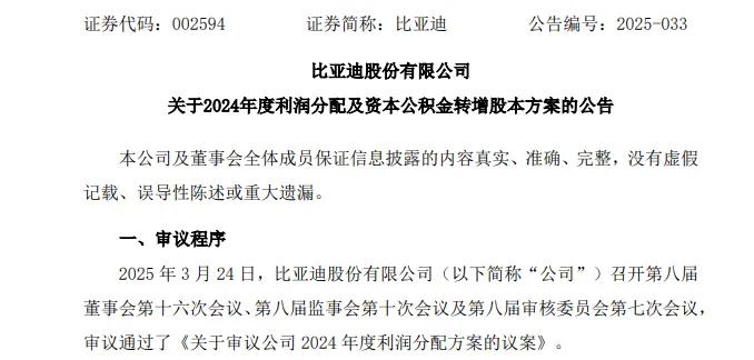 2024年报同时披露的利润分配方案显示,比亚迪计划以目前总股本30.39亿股为基数,向全体股东每10股派发现金红利人民币39.74元(含税),现金红利总额约为120.77亿元,创历史新高。