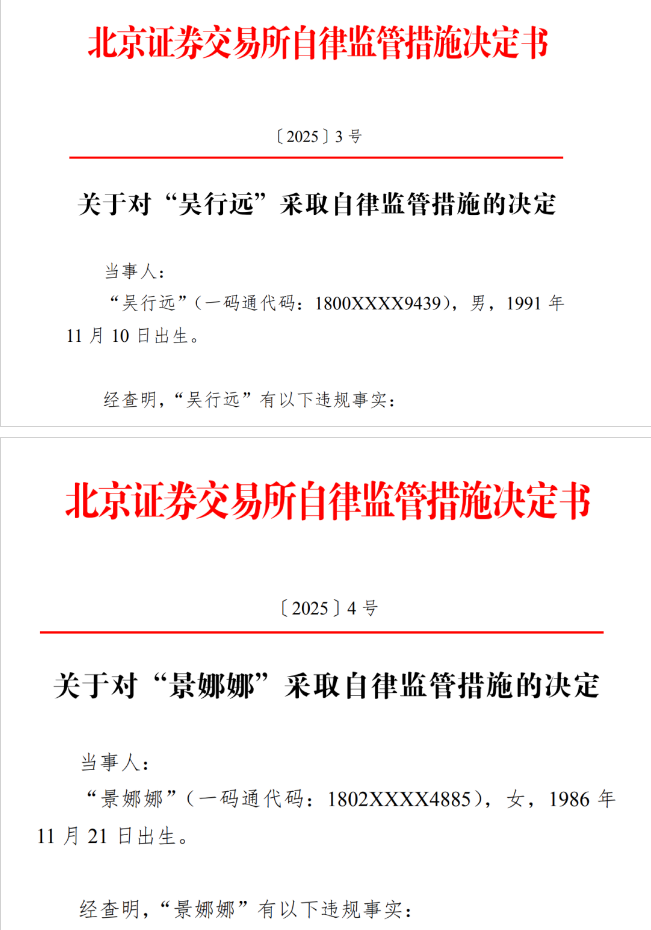 北交所表示,两人交易行为违反了《北京证券交易所交易规则(试行)》相关规定。*ST广道为退市风险警示股票,近期多次因价格异常上涨停牌核查,“景娜娜”账户的异常交易行为,持续强化股票涨幅限制价格状态;“吴行远”账户的异常交易行为,导致股票价格继续大幅上涨。两人账户行为均可能误导其他投资者,情节十分严重,市场影响恶劣。