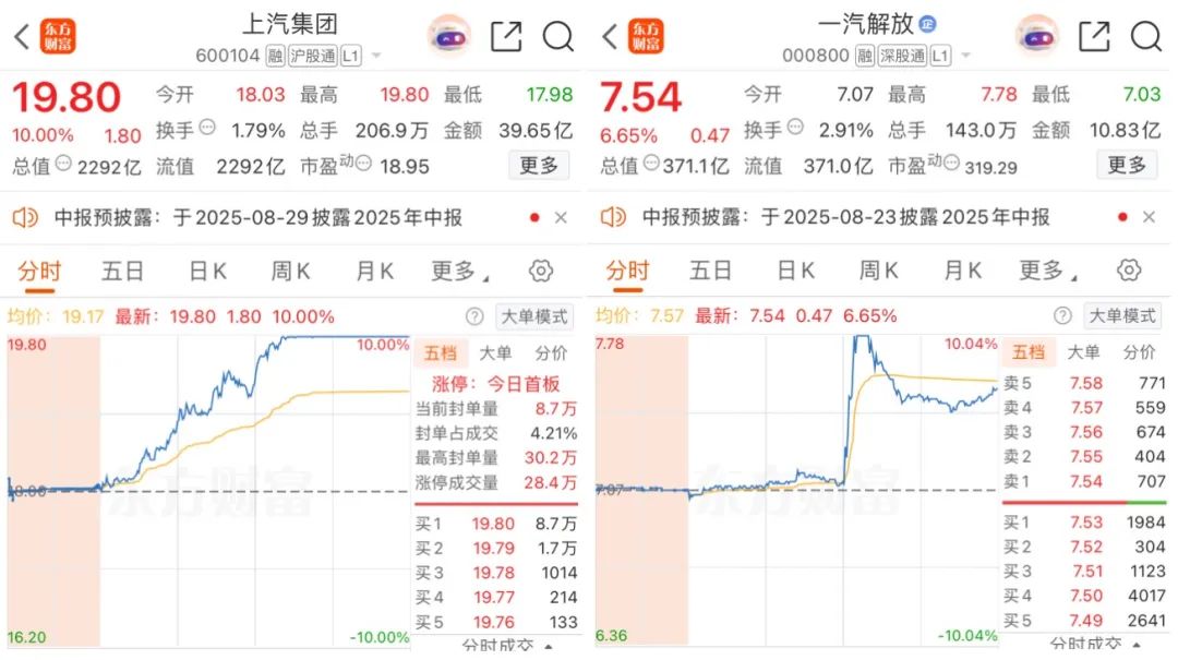 受此消息影响,午后汽车整车板块异动,上汽集团涨停,一汽解放一度触及涨停。江淮汽车大涨7%,宇通客车、金龙汽车、东风股份、长城洗车等跟涨。