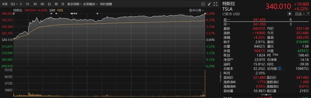 8月22日,美股特斯拉收涨6.22%。创2个月以来最大单日涨幅,其市值一夜增加644亿美元(约合人民币4614.71亿元)。