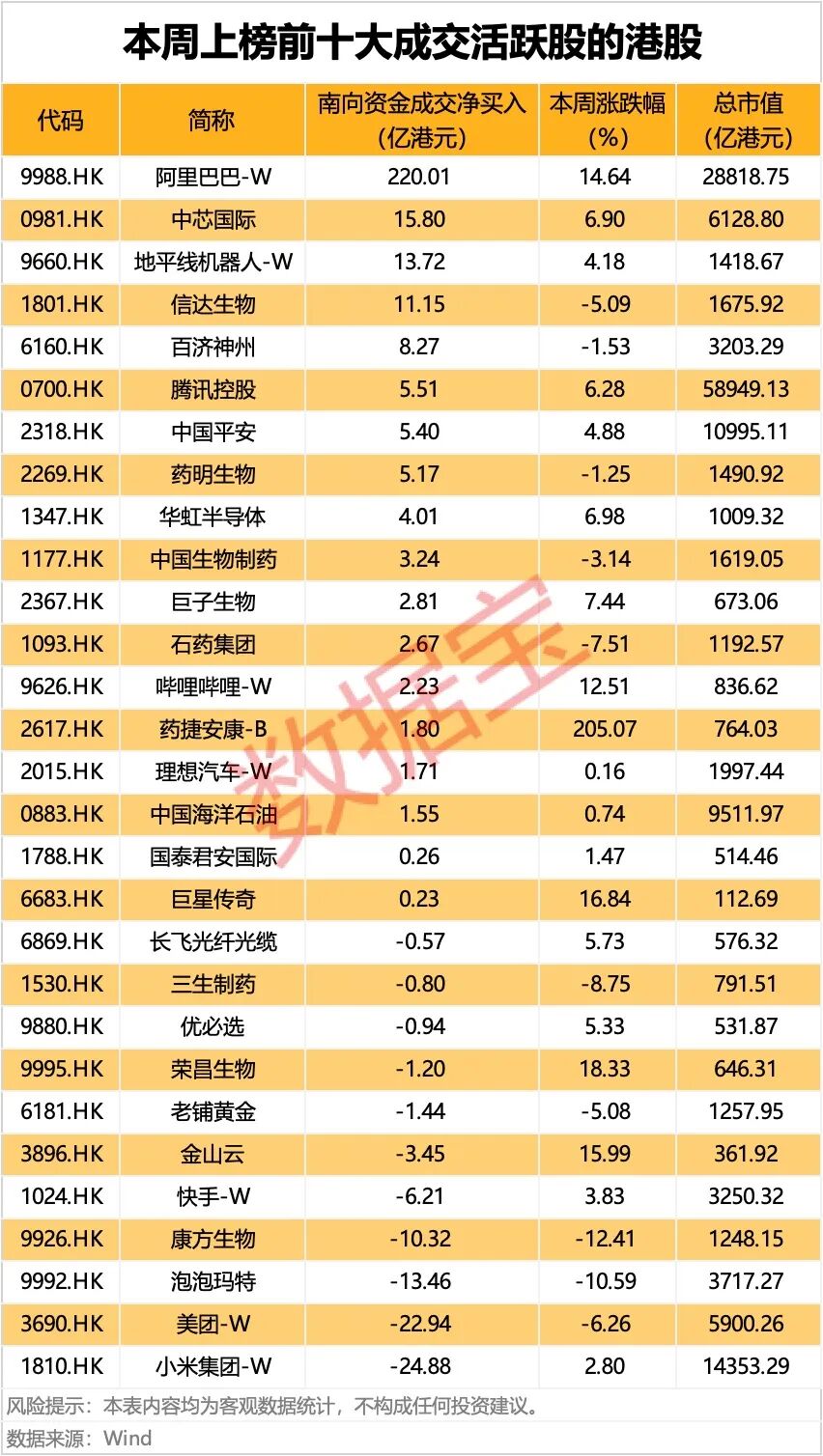 从本周上榜每日前十大活跃股的名单来看,本周共有29股上榜,其中阿里巴巴-W本周港股通成交总额最高,达到702.7亿港元;美团-W、中芯国际、腾讯控股本周港股通买卖总额均超过200亿港元。