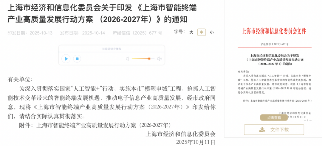 10月14日,据上海市人民政府网站消息,上海市经济和信息化委员会日前印发 《上海市智能终端产业高质量发展行动方案(2026—2027年)》,从三个方面提出了20条具体举措,培育壮大上海智能终端产业。