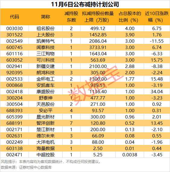 11月6日,21家公司发布了减持计划,拟减持比例居前的有祖名股份、上大股份、凯美特气、闻泰科技(维权)等。从股价表现看,凯美特气、闻泰科技等多只热门股今日早盘一度跌超5%。