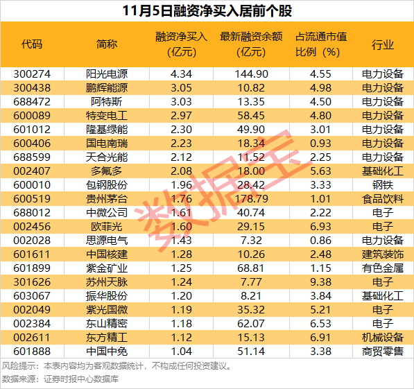 具体到个股,11月5日获融资净买入千万元以上的有460只,其中21只融资净买入额超1亿元。阳光电源融资净买入额居首,当日净买入4.34亿元;其次是鹏辉能源、阿特斯,融资净买入金额分别为3.05亿元、3.03亿元,融资净买入金额居前的还有特变电工、隆基绿能、国电南瑞等。