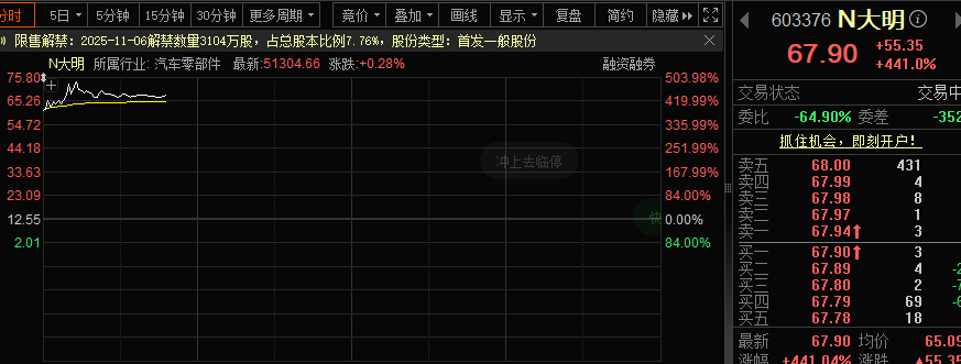 N大明今日上市,开盘价61.10元,上涨386.85%,早盘最高涨超500%。