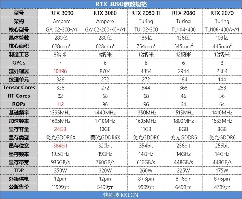 RTX 3090基于GA102-300-A1核心,拥有7组GPC,82组SM单元共计10496个流处理器、112个ROP、328个纹理单元、328个第三代Tensor Cores、82个第二代RT Cores。搭配24GB GDDR6X显存,显存频率19.5GHz、位宽384Bit、带宽936GB/s。
