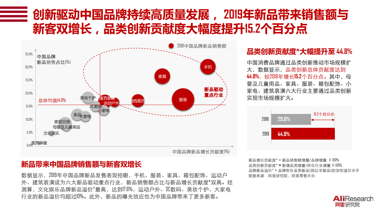 阿里研究院《2020中国消费品牌发展报告》显示,2019年线上中国品牌市场占有率达到72%,其中医药健康、美妆个护、食品行业线上中国品牌市场规模同比增幅位居前三。中国品牌继续通过品类创新推动市场规模扩大,品类创新对市场规模扩大的总体贡献度达到44.8%,较2018年增长了15.2个百分点。