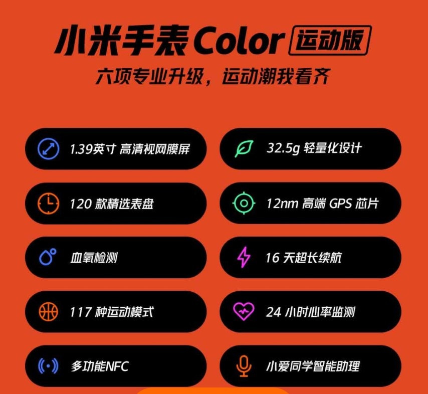 小米手表 Color 运动版,内置 12nm 高端 GPS 芯片,支持四模同开,每秒实时定位。支持 16 天超长续航,50 小时 GPS 运动续航。支持 117 种运动模式,24 小时心率监测,支持小爱同学智能助理,多功能 NFC 可刷地铁公交 / 门禁 / 支付宝。
