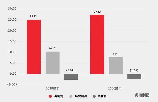 而从净利润上看,名创优品目前还是在亏损——在剥离了一些亏损业务等非经常性损益之后,2019财年名创优品的亏损额2.94亿元,2020财年的亏损为2.61亿元。但是,招股书也显示,和主营业务相关的经营利润依然维持在良性的状态:2019财年名创优品的经营利润为10.17亿元,2020财年为7.67亿元。