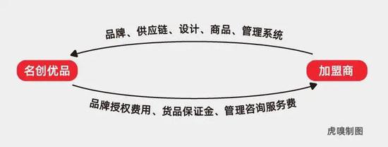 加盟是名创优品开店的主要方式,但与只输出品牌授权式的加盟方式不同,名创优品提供的是“保姆式管理”。具体来说,名创优品向加盟商以及经销商提供品牌授权、供应链(产品)、设计和管理系统,加盟商只负责店铺的租赁装修,同时缴纳授权费、货品保证金以及管理咨询费用等等。至于财务系统,所有收入由名创优品统一收账,但是次日会和加盟商进行即时结算分账。