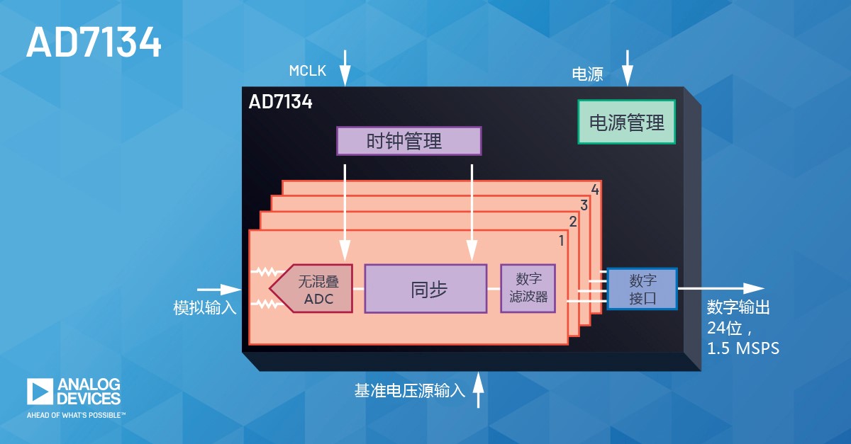 AD7134是一款四通道24位精密ADC,输出数据速率的范围为10SPS至1.5MSPS。其本身具备高达102 dB的抗混叠能力,无需使用外部抗混叠滤波器,因此所需无源元件和有源元件分别减少60个和5个。相比典型的替代方案,电路板面积缩小70%。异步采样速率转换器可以简化多器件同步,让用户能够轻松实现稳定的采样系统,并简化隔离要求。