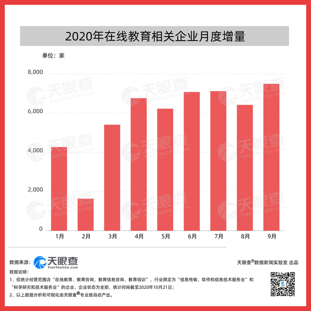 天眼查专业版数据显示,我国目前共有超过28万家从事在线教育相关业务的企业。截至10月21日,以工商登记为准,2020年前三季度共新增超过5.2万家相关企业(全部企业状态),同比增长6.8%。其中第三季度新增超过2.1万家相关企业,环比增长4.8%。