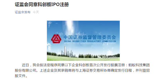 证监会官方微信公众号消息,近日,我会按法定程序同意以下企业科创板首次公开发行股票注册:蚂蚁科技集团股份有限公司。上述企业及其承销商将与上海证券交易所协商确定发行日程,并刊登招股文件。