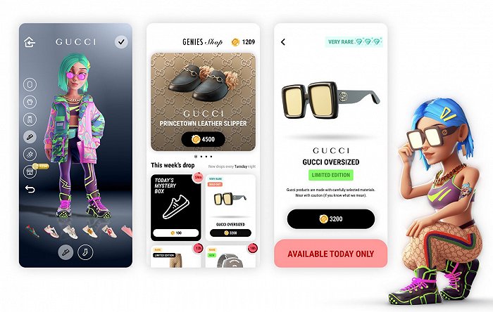Genies 的用户可以访问“Gucci wheel”,那里有 Gucci 品牌的各种服装和配饰,用户可以给自己的虚拟形象购买并穿上喜欢的衣服。Gucci 的员工也可以使用这些虚拟形象来展示自己的个人风格。Gucci 的执行副总裁兼首席营销官 Robert Triefus 说:“在Gucci,我们欢迎实验。在过去的五六年里,鼓励表达自我一直是我们的主题。……我们有2万名员工,这是他们展示自我的一种有趣的方式。”