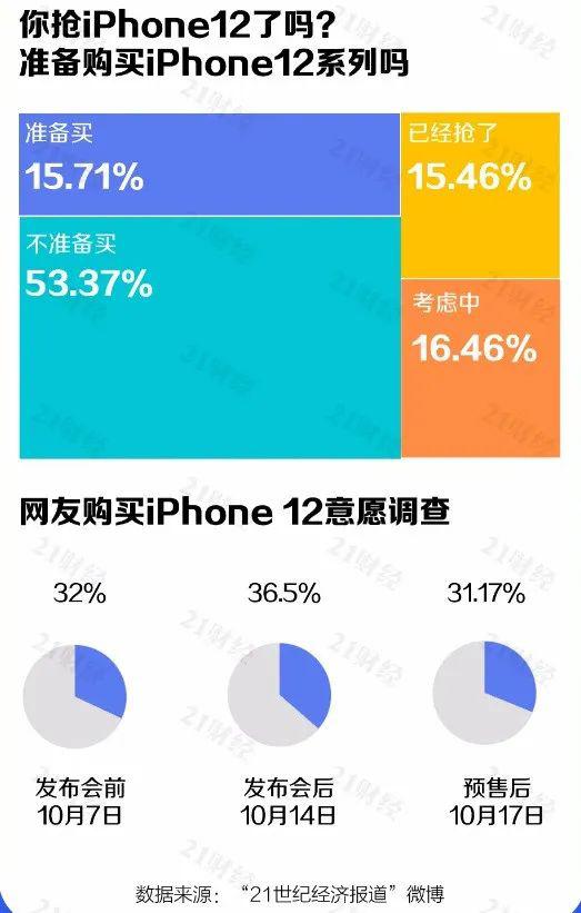 此前据21网调实验室进行多项调查发现,无论是发布会前,还是发布会后,始终有3成网友愿意为iPhone 12系列买单。选择买的人可能拥有品牌偏好和商品购买行为,而选择不买的人占半数以上,出于吃瓜等心态,他们会积极地参与到苹果的吐槽中。