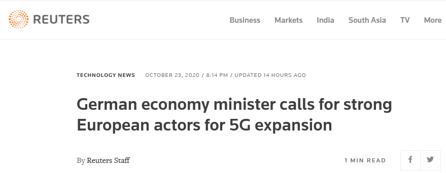 路透社称,阿尔特迈尔是周五在欧盟竞争部长举行的视频会议后作出的如上表示。阿尔特迈尔称,他并不反对华为。不过他补充说,这一领域需要强大的欧洲参与者。