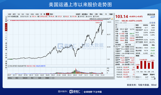 再看一家公司,同样具有支付业务的美国运通(American Express)。由于它涉及了借贷业务,继而卷入金融周期,因此长线成长性比VISA和MasterCard要差得远。