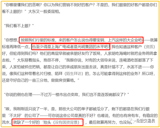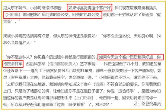 一次尽调结束后,作者跟随的前辈向信贷员发怒:"你一开始就认定了我俩是'冤大头'"。因为在银行贷款过程中,如果客户资质优秀,那么来回的交通费都可以算入借贷成本。而那次尽调,作者是坐地铁往返,说明信贷员认为这次客户资质不够,很有可能是白跑一趟。