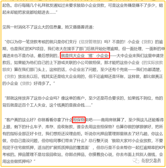在银行实践中,很多借到钱的小微企业都是大企业的附属/关联公司,大公司为他们提供担保(无论是显形的还是隐形的),而小公司把钱用于大公司的业务。