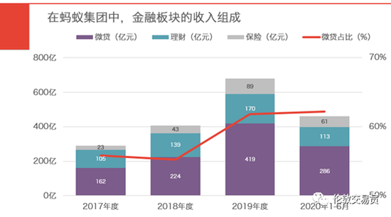 而在占了蚂蚁一半以上营收的数字金融中,微贷业务又贡献了其一半以上的收入。