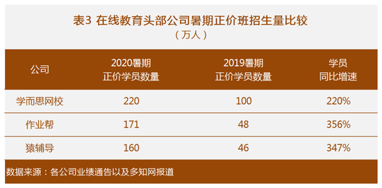 教育行业最核心的指标是正价课招生量:学而思网校220万,作业帮171万,猿辅导160万;去年暑期三家分别是100万、48万、46万;同比增速220%、356%、347%。