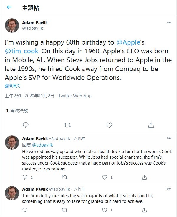 苹果首席执行官蒂姆·库克(Tim Cook)今天迎来了 60 岁生日。他于1960年11月1日出生在美国南部亚拉巴马州的罗伯茨代尔,父亲是父亲唐纳德·库克(Donald)是造船厂工人,母亲嘉尔德·库克(Geraldine)是家庭主妇。在他执掌苹果以来,创造了很多骄人的战绩,公司市值在今年 8 月首次突破了 2 万亿美元大关,成为市值最大的美国公司。