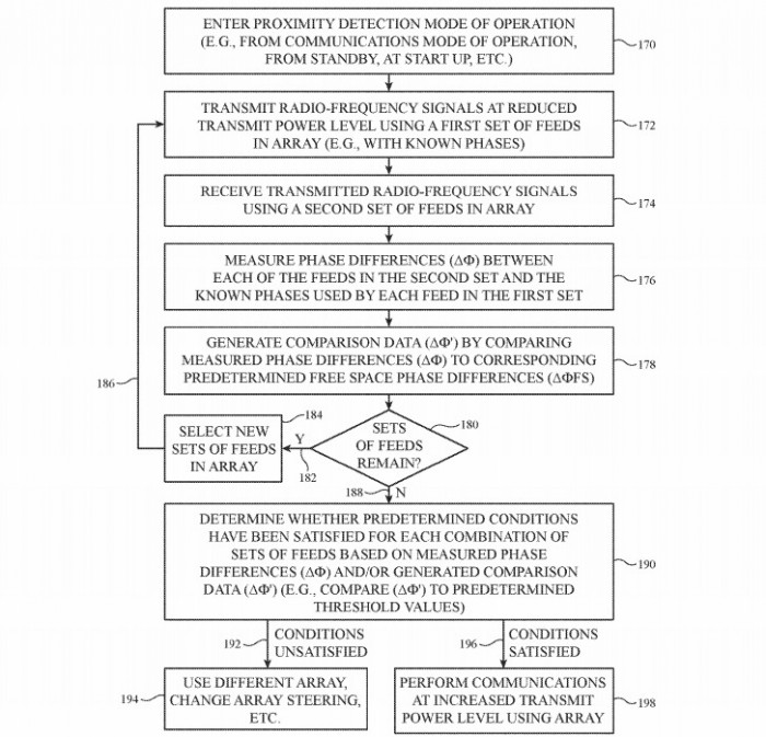 这个相位差值可以可行地用于执行物体接近检测操作,即判断附近是否有东西。如果检测到的差值与预定义的标定值相比,超过了一定的阈值,就可以比较确定地知道附近有物体在干扰信号。确定存在阻挡物体后,设备就可以禁用相位天线阵列,选择不同的阵列配置。反之,如果研究出没有阻挡物,系统就可以安全地增加传输的功率水平。