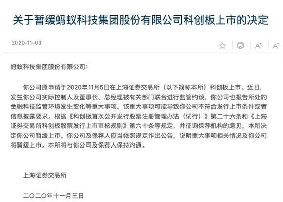 11月3日晚间,上交所网站信息显示,上交所发布关于暂缓蚂蚁科技集团股份有限公司(下称“蚂蚁”)科创板上市的决定。