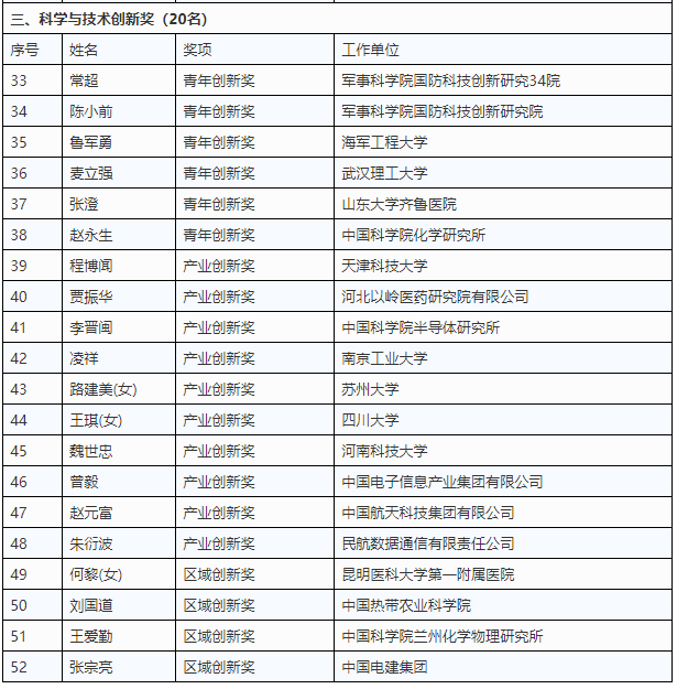 52位获奖人中,男性47人,女性5人。最年长的84岁,最年轻的年仅37岁,平均年龄约55.6岁,较前两年有所降低。两院院士获奖人数占总数的34%,非两院院士获奖人数占总数的66%,中青年科学家成为主体。“青年创新奖”获奖人数占创新奖总数的40%。