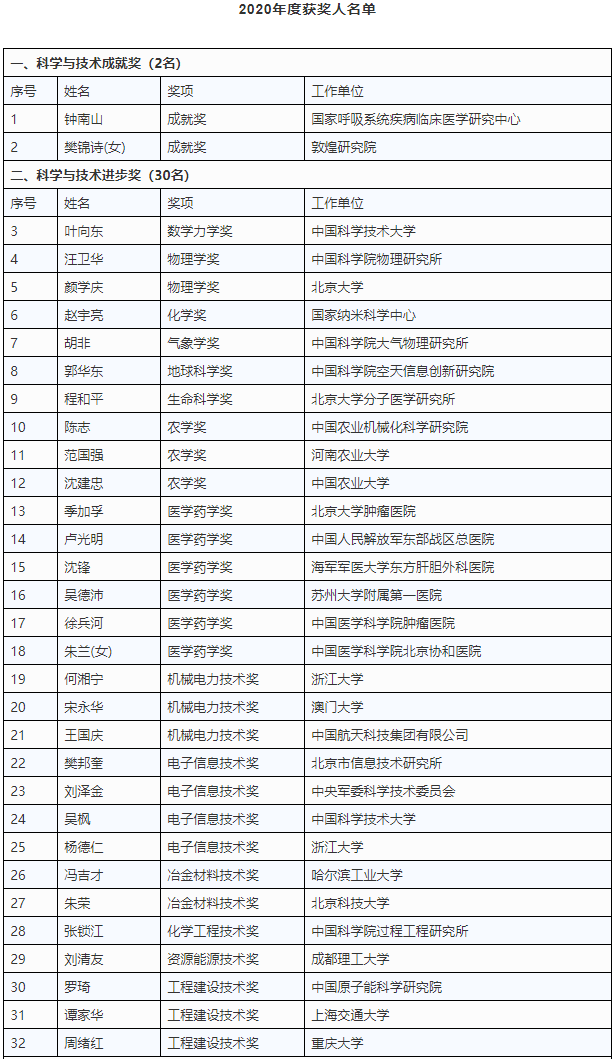 何梁何利基金科学与技术奖2020年度获奖人名单