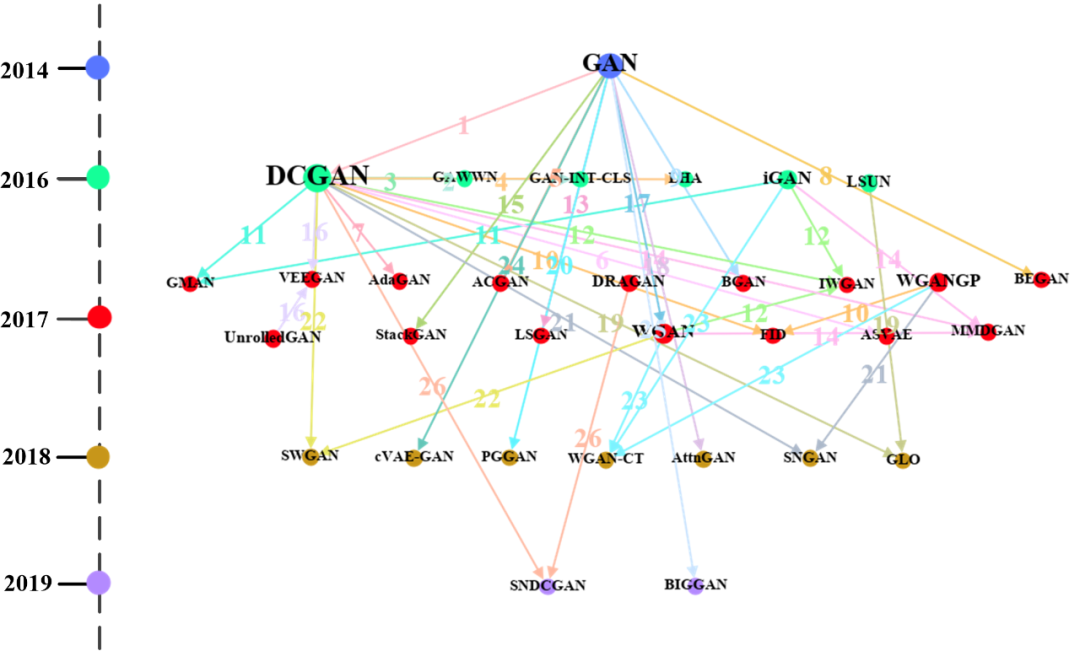 Figure 14:'GAN' 簇中方法的路径图,图中点的颜色表示年份,点的大小表示出度,线的颜色表示数字代表的数据集。