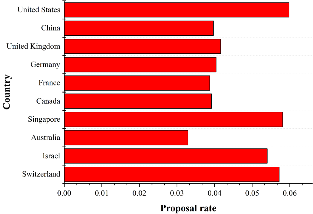 Figure 6:图 4 和图 5 中排名前 10 国家中有效 AI 标记的提出率。国家提出的 AI 标记的数量从上到下递减。
