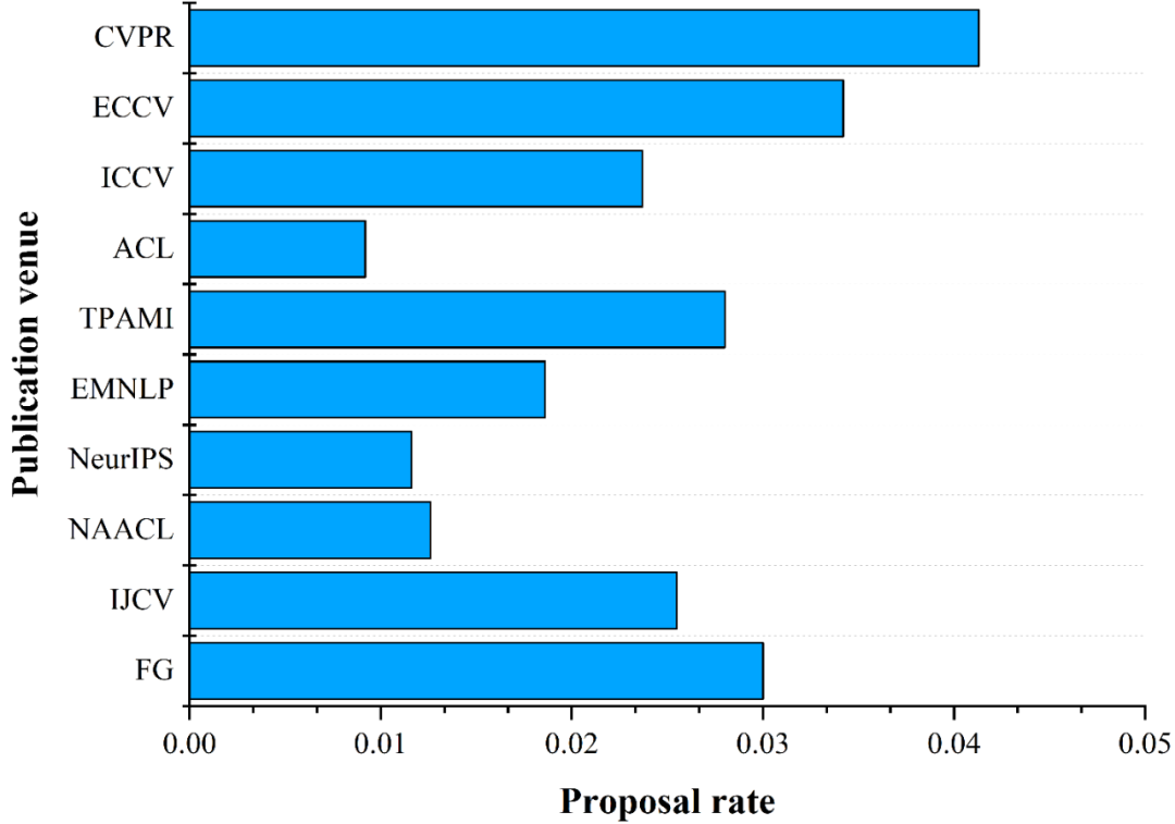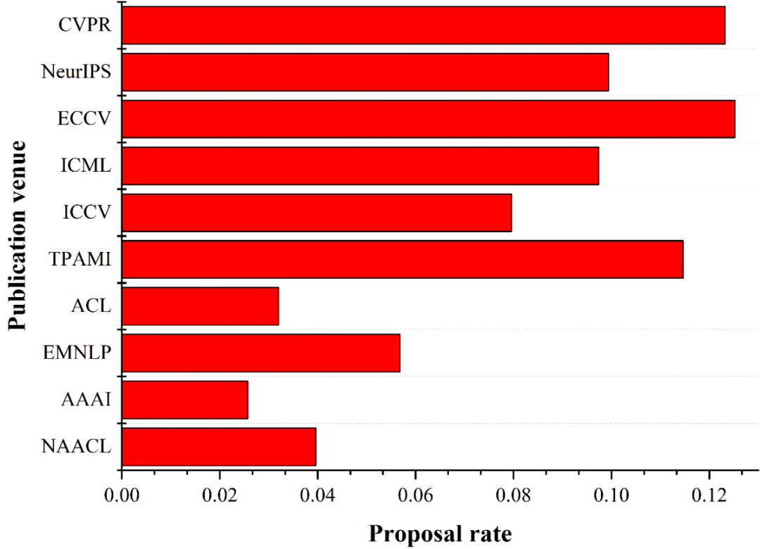由图 10 可知,随着时间的发展,有效方法在数据集上的传播率呈逐渐上升的趋势,各种知名方法在文献未正式发表以前就通过类似 arxiv 的渠道为人们熟知。
