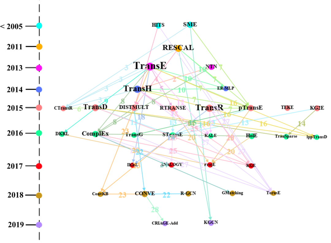 图 13 是'Trans' 簇中的方法路径图。经与 Ji 等人 [9] 发表的文献内容核对,'Trans' 簇中的方法路径图包含上述论文提到的 76% 的知识表示学习算法,同时也包含一些与知识表示学习相关的方法。例如:GMatching 和 KGE 是图嵌入方法,HITS 是链接分析方法。