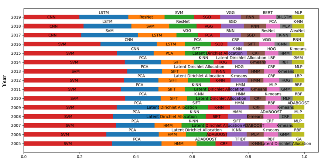 在我们的研究中,首先利用实体抽取模型对大规模 AI 文献中的 AI 标记进行抽取,并对有效 AI 标记(方法和数据集)进行统计分析。其次,我们对抽取的有效方法和数据集进行原始文献的溯源,对原始文献进行统计分析,并且研究了有效方法在数据集上和在国家之间的传播规律。最后,根据方法和研究场景共现关系来实现对方法和研究场景的聚类,得到方法簇和研究场景簇。基于方法簇及关联数据集绘制路径图,研究同类方法的演化关系,基于研究场景簇来分析方法对研究场景以及研究场景之间的影响关系。