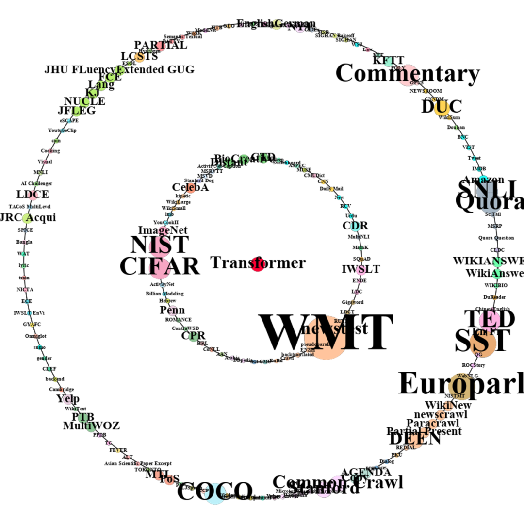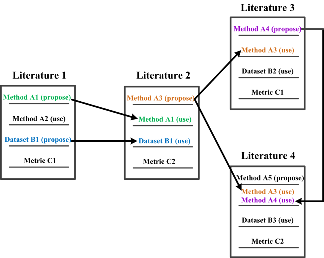 我们的路径图构建同 [28] 中的方法存在两点区别:1)我们增加了数据集的关系,方法和方法之间通过数据集建立联系,从而提供了额外的信息;2)我们通过大规模文献来获取方法,可以同时得到大量的路径图。