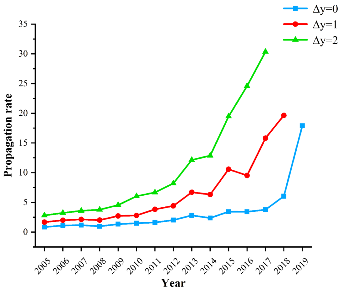 我们对 2005 年到 2019 年每年由 CCF corpus 中的文献提出的有效方法在数据集上的传播情况进行了分析。y 年提出的有效方法于 y 到 y+△y 时间区间内在数据集上的传播率