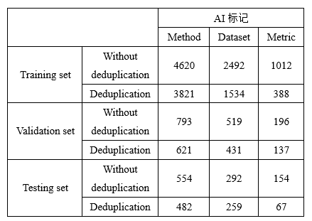 在构建 AI 标记抽取模型时,我们将 TMEdata 按照 7.5:1.5:1 的比例划分成训练集、验证集和测试集。训练集、验证集和测试集中包含的三种 AI 标记的数量如表 2 所示。