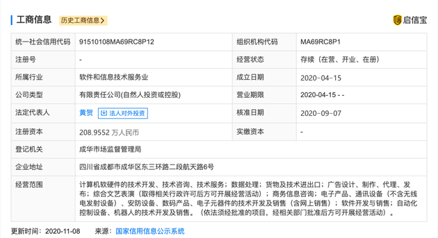 启信宝显示,星空野望成立于今年4月,注册资本为208.9552万元。公司经营范围包括计算机软硬件的技术开发、技术咨询、技术服务以及数据处理等等,公司第一大股东为黄贺。倒是李钧、罗永秀并不在启信宝显示的星空野望股东名单中。