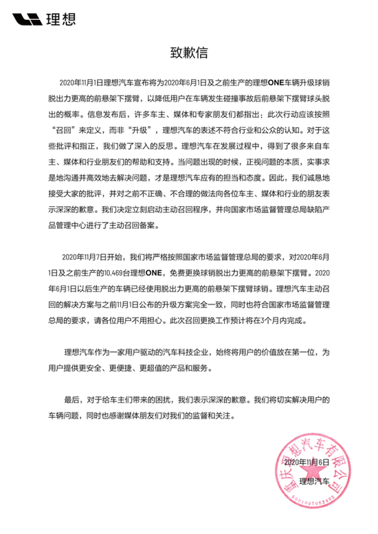 在出现多次断轴之后,理想汽车官方11月6日发布致歉信,宣布召回10469辆理想one汽车,将此前的“硬件升级”表述改为“主动召回”。