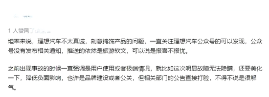有网友表示,“理想汽车不太真诚,刻意掩饰产品的问题”。
