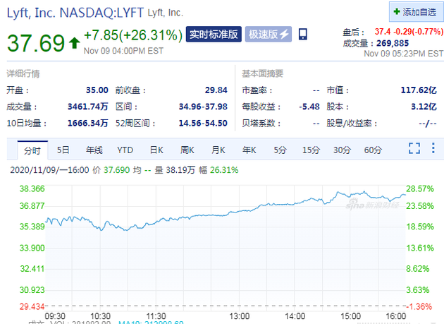 北京时间11月10日凌晨消息,受辉瑞新冠疫苗消息提振,周一收盘,出行概念股Lyft股价大涨26.31%,报37.6美元,Uber收涨7.38%,报48.18美元。