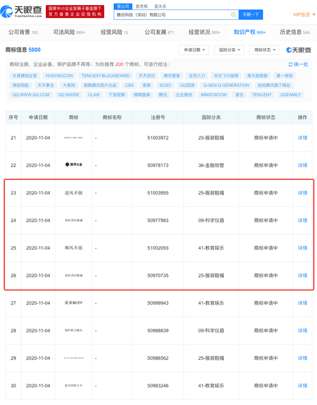 新浪科技讯 11月10日上午消息,天眼查App显示,近日,腾讯科技(深圳)有限公司申请注册“顺风不浪”、“逆风不倒”、“稳住我们能赢”等商标,国际分类涉及科学仪器、教育娱乐等,商标状态显示为“商标申请中”。
