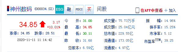 新浪科技讯 11月11日上午消息,神州数码涨停,截至发稿,股价涨10%至34.85元。当前市值为229.55亿元。