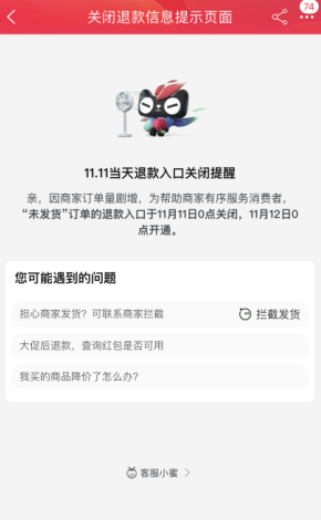 还有消费者反映,因为平台双11当天无法退款,造成了一些问题。平台官方显示,“因商家订单量剧增,‘未发货’订单于11月11日0点关闭,11月12日0点开通。”