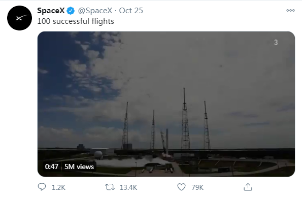 前不久,SpaceX官方曾在Twitter上分享了一则100次成功发射视频集锦。